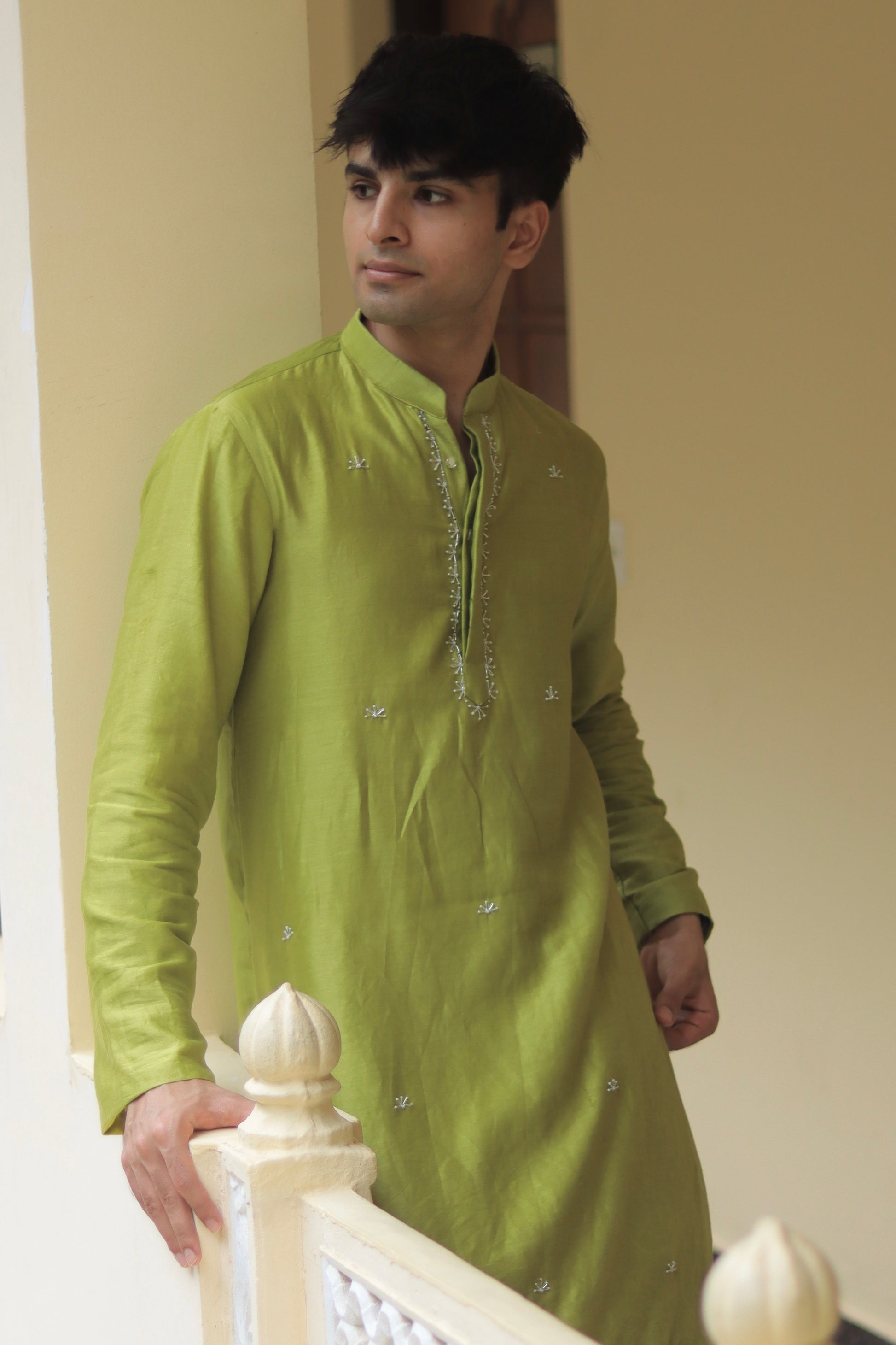 The Kurta Is Detailed With Zardosi Embroidery In Silver And Enhanced With Pearls. The Geometrical Motifs Are Placed All Over In  the Front. The Blinging Ensemble Has All The Festive Mood.